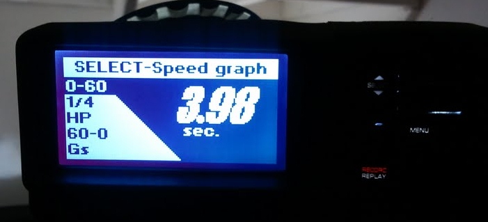 You can display of speed vs time will give you 0-60mph (0-100kmph) or increasingly popular 0-100mph time. You can even get passing times like 40-60mph, for example.