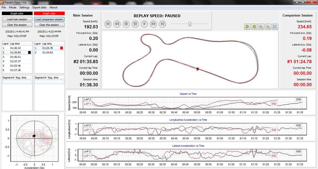 Real-Time Replay screen shows the map of the track and the cursor indicates where your car was on the track at that time. Current Acceleration, Braking G's, Speed and Lap# are displayed on the top of the screen. Replay can be sped-up or slowed down with the ROLLER button. Current replay speed is indicated by the Play indicator. You can also jump laps at any given moment so it's easy to see what you did differently compared to the fast lap. It's so powerful, yet so easy to learn, not to mention fun!