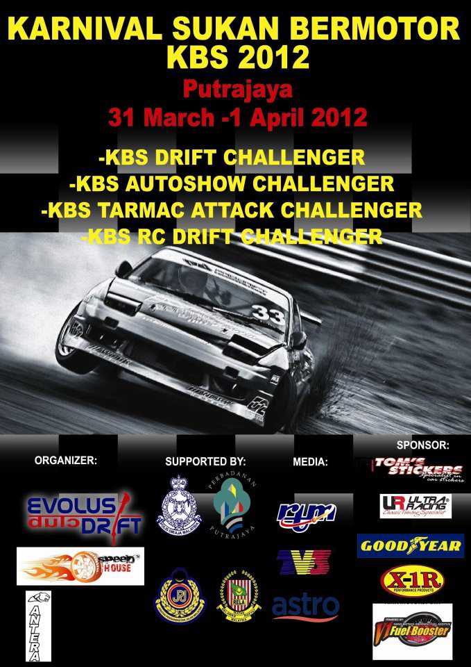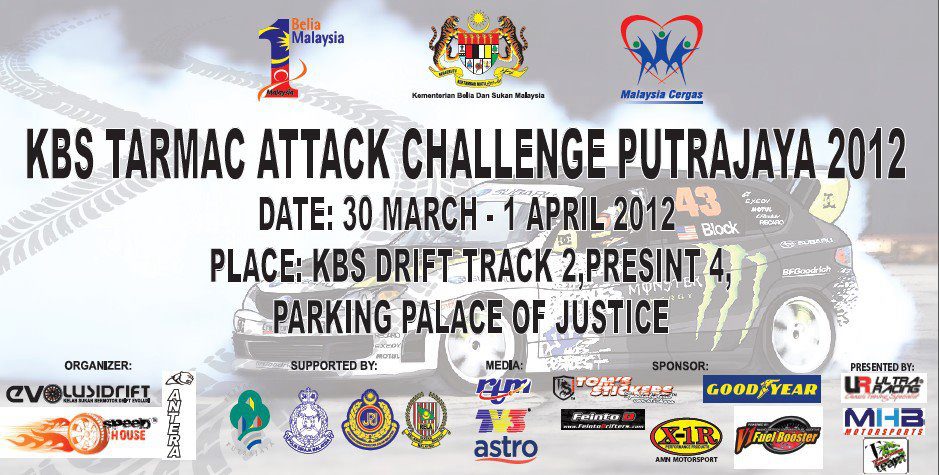 KBS Tarmac Attack 2012 (Round 1 out of 3) is sponsored by Kementerian Belia & Sukan, exclusively brought to you by Speed House & technically supported by Wheelspin & Kelab Sukan Bermotor Drift Evolusi on 1st April-2012 at Putrajaya from 9am-6pm.