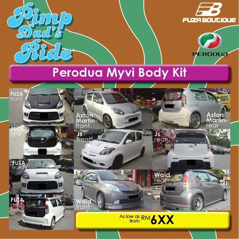 The Myvi body kits are selling from RM6xx. Style like Fuza, Aston Martin, Wald, JS and many others are available.