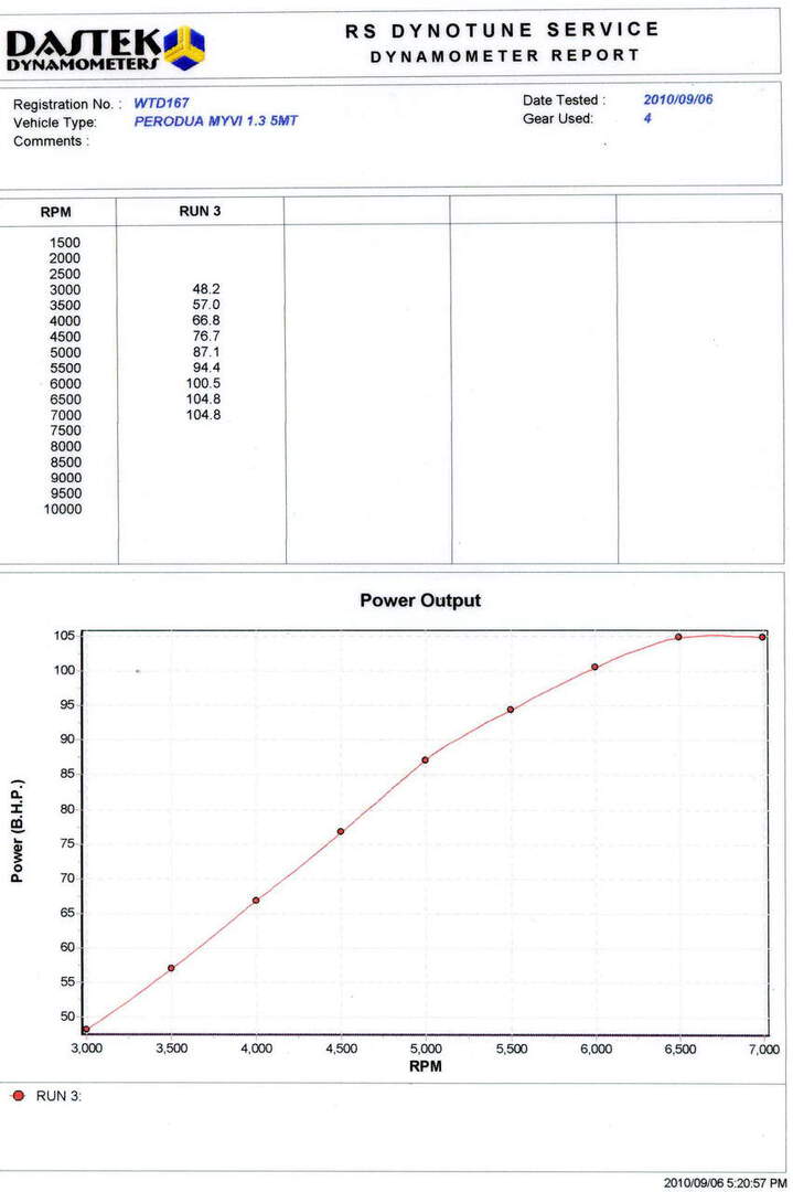 Below dyno result for 100% stock perodua myvi 1.3.Standard around 85bhp.After install the performance remap chip its increase around 20bhp.Its can increase more if other modification like sport air filter or sport exhaust system install and the performance remap chip will recalibrate to match with the modification.