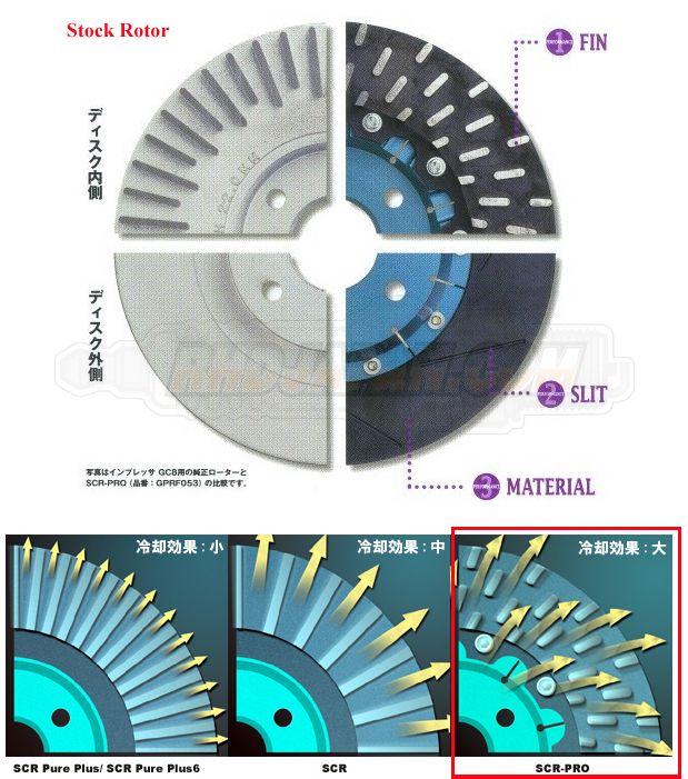 SCR-PRO rotors are constructed as a two-piece rotor design. SCR-PRO rotors are developed from super tough FC Cast Iron Material and are heat-treated for reliability, durability and thermal stability under aggressive driving. The affixed bell housing is made from a billet aluminum alloy for strength as well as reduction of unsprung weight. They are manufactured from the factory featuring a slotted and dimpled surface to facilitate better pad wear and maximize cooling and braking performance. SCR-PRO rotors also feature a specially designed internal vane to improve heat dissipation from the rotors.