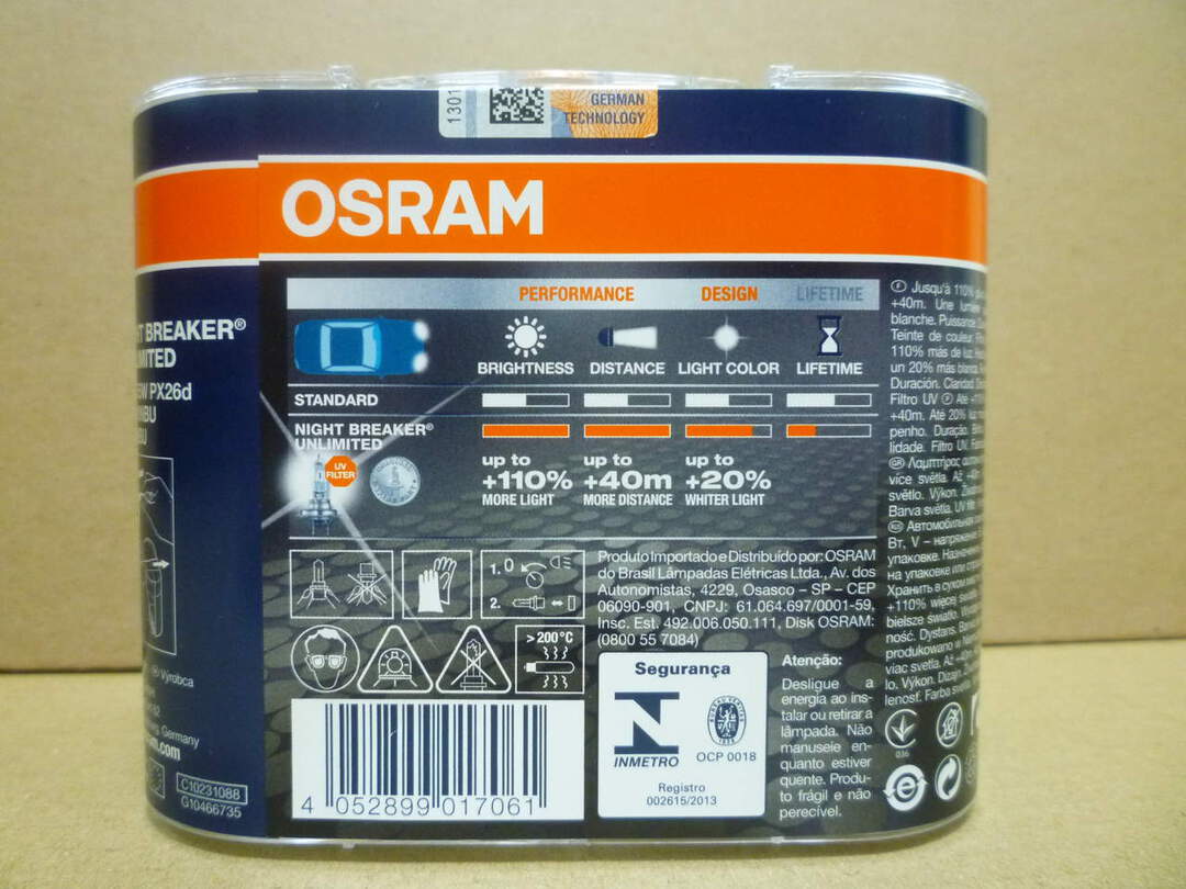 The OSRAM NIGHT BREAKER® UNLIMITED series is the very latest generation in high quality automotive halogen bulbs from Osram. The previous bulb in the series, the 'Night Breaker® Plus' has won various top consumer awards over the past few years and has been successful around the world. So this new and improved version is from no exception of possibly winning even more prestigious titles. Recommended to all who seek an increase in safety and brightness on the road.